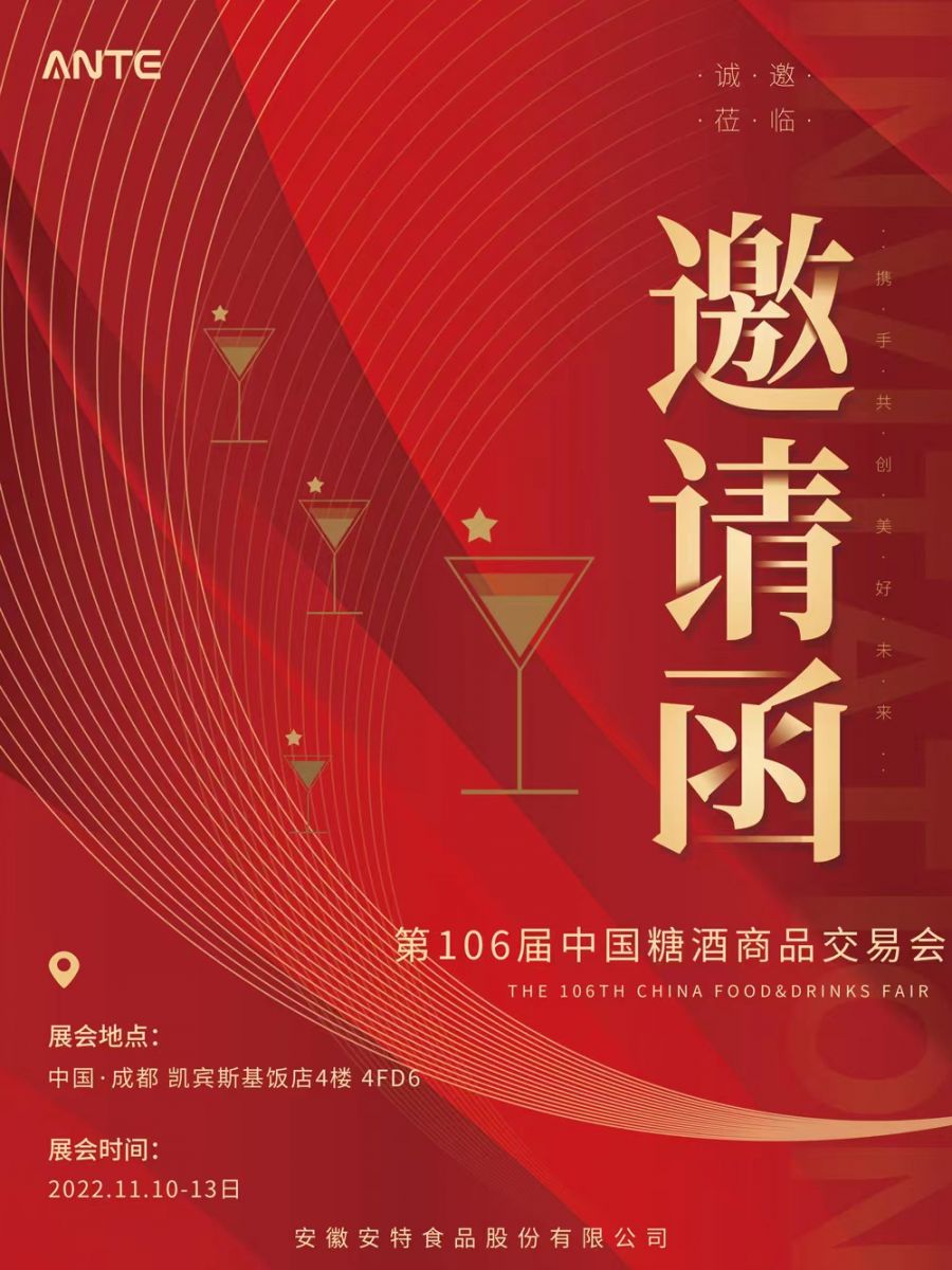 2022年11月10日-13日,第106屆全國糖酒會在成都開幕,安特攜眾多產品精彩亮相本次大會。我們誠邀您蒞臨安特展臺,共鑒美酒!